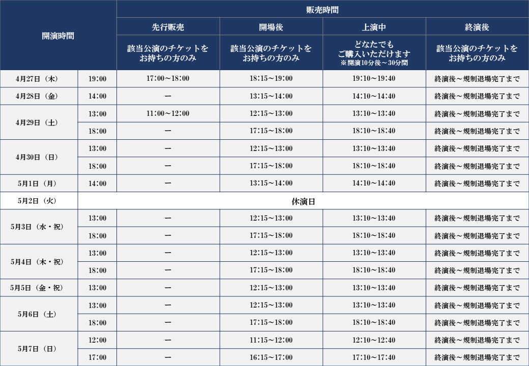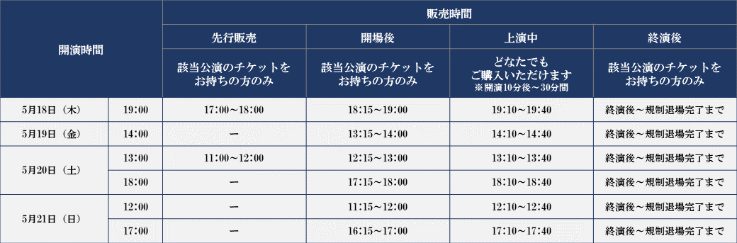本会場でのグッズ販売におきまして、公演により販売時間・購入可能者が異なります。